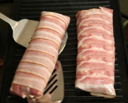 свинското бон филе се разтваря с остър нож и се маринова за час със смес от черен пипер лимонов сок и соев сос.